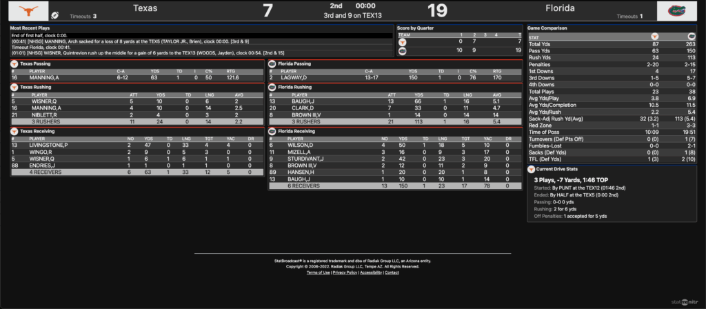 10/04/2025 04:06:17 PMFlorida took total control in the first half of Saturday’s game against Texas and led 19-7 heading into halftime. The Gators had 263 yards of offense while holding the Longhorns to just 87. DJ Lagway was efficient, going 13-of-17 for 150 yards and a touchdown while Jadan Baugh led the rushing attack with 65 yards and a touchdown.