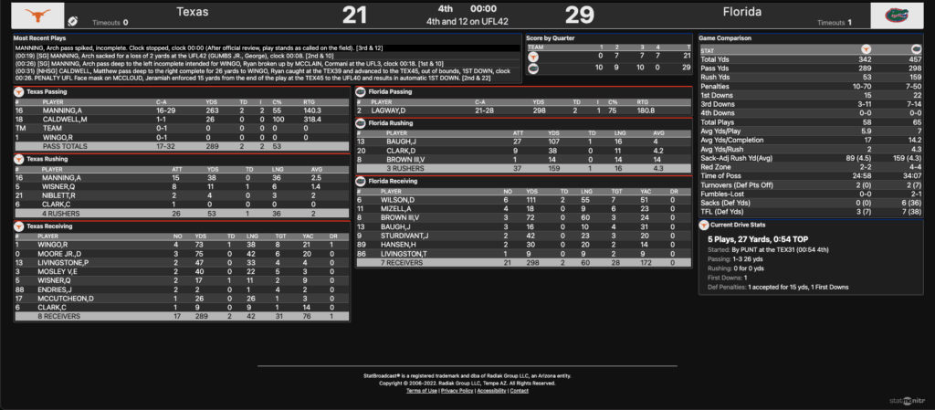 10/04/2025 05:10:27 PMFlorida has all the momentum following Dallas Wilson’s 55-yard touchdown and takes a 29-14 lead into the fourth quarter. Texas will face a 2nd and 4 after the timeout, looking to make a late surge and avoid an upset.