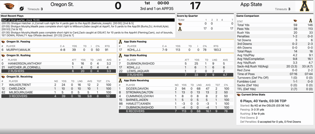 10/04/2025 03:09:18 PMOregon State has a 3rd and 1 to start the second quarter at the App State 35 trailing 17-0…