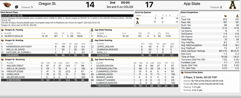 At the half, App State leads Oregon State 17-14