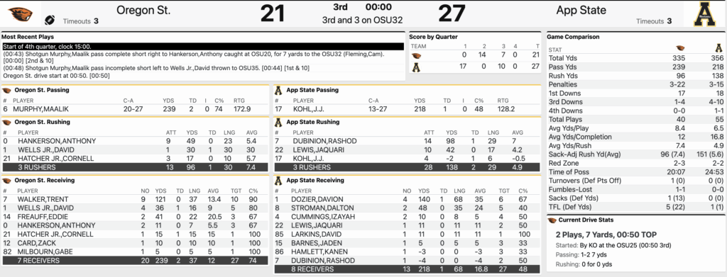 10/04/2025 06:01:40 PMYou can’t say Oregon State didn’t have chances in this ballgame late, but ultimatley were stopped short of the goal line on their penultimate drive, and couldn’t overcome a critical late-game sack on Maalik Murphy. Oregon State’s final drive ended in an interception that was tipped up by Walker, and snagged by App State… Many questions remain as the Beavers have fallen to 0-6 on the year. It’s their worst start since 1991, Pettibone’s first season…