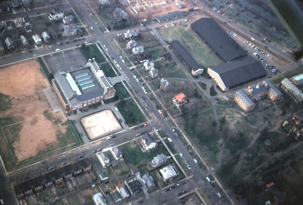 Was looking at some Arial photos of Piscataway and stumbled on this 1952 color photo of the college ave gym before the paved parking lot was installed behind it. And I assume from historical accounts, the dirt/ grass field behind the gym in the lower left of the photo is where the first ever College football game against Princeton was played. College ave was quite different then. Houses were directly across the street from the gym, and no Browers Commons yet. Looks like there may be 3 outdoor bball courts to the west of the gym... but tough to make that out for sure.