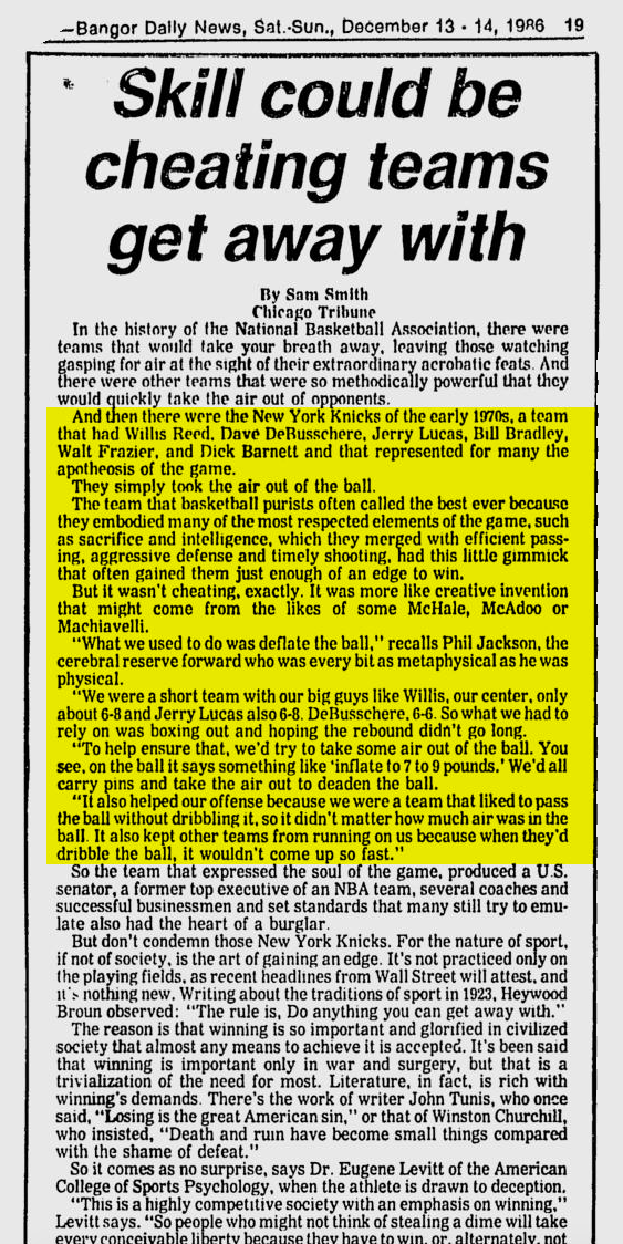 Phil Jackson, quoted in 1986, saying that championship New York Knicks teams intentionally deflated basketballs: pic.twitter.com/wJqAnC6fRQ