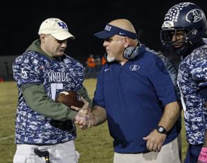 Marine Cpl. Matt Bradford said it meant the world to him that ahead of the game Dinwiddie head football coach Billy Mills (center) let him speak to the players on the team for which he used to play.
