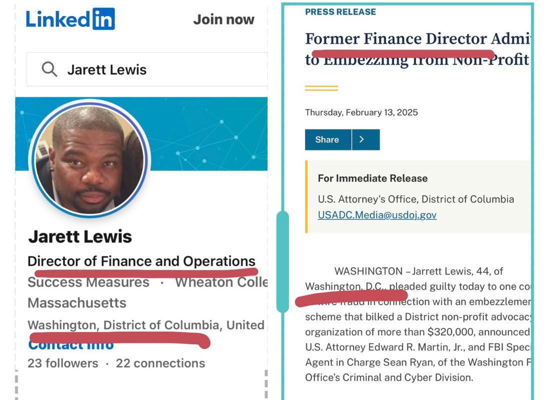 For even more proof, his LinkedIn profile (https://www.linkedin.com/in/jarett-lewis-5b894b211/) shows he lives in DC and is a "Director of Finance," and as the DOJ press release makes clear, Lewis was based in DC and was the "Direct of Finance" at the non-profit victim. P.S. -- I do this for a living (criminal defense).