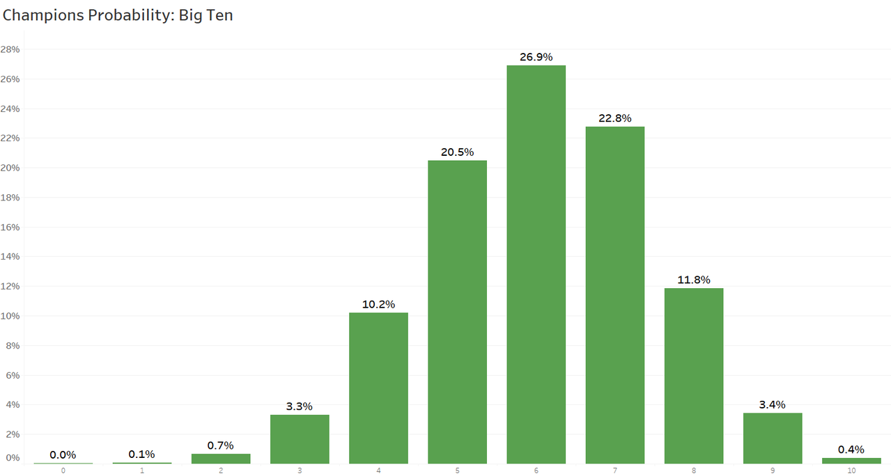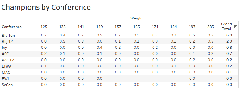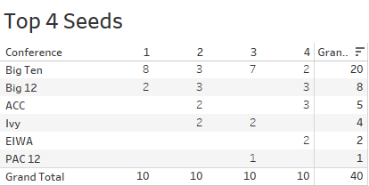 91% of champions come from the top 4 seeds. With 20 of the 40 top seeds the Big Ten dominates this space.