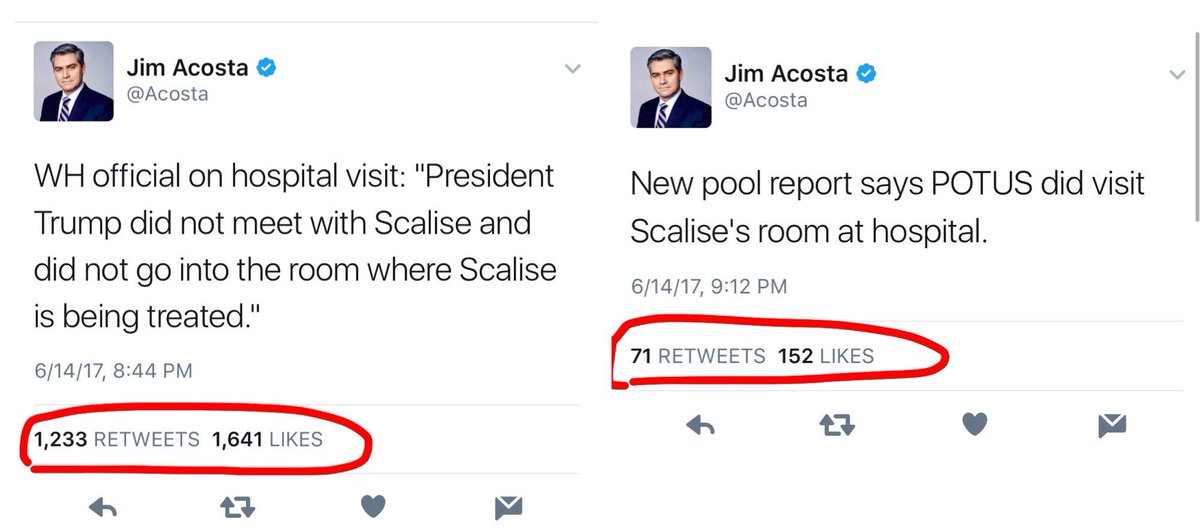 Fake news @CNN reporter, @Acosta tweets a complete lie a/b @POTUS that gets almost 1200 more RT's than the correction. #ScaliseShooting