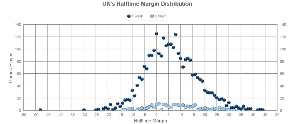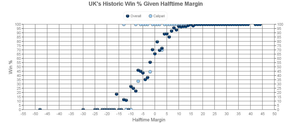 First is UK's winning percentage vs. their halftime margin.