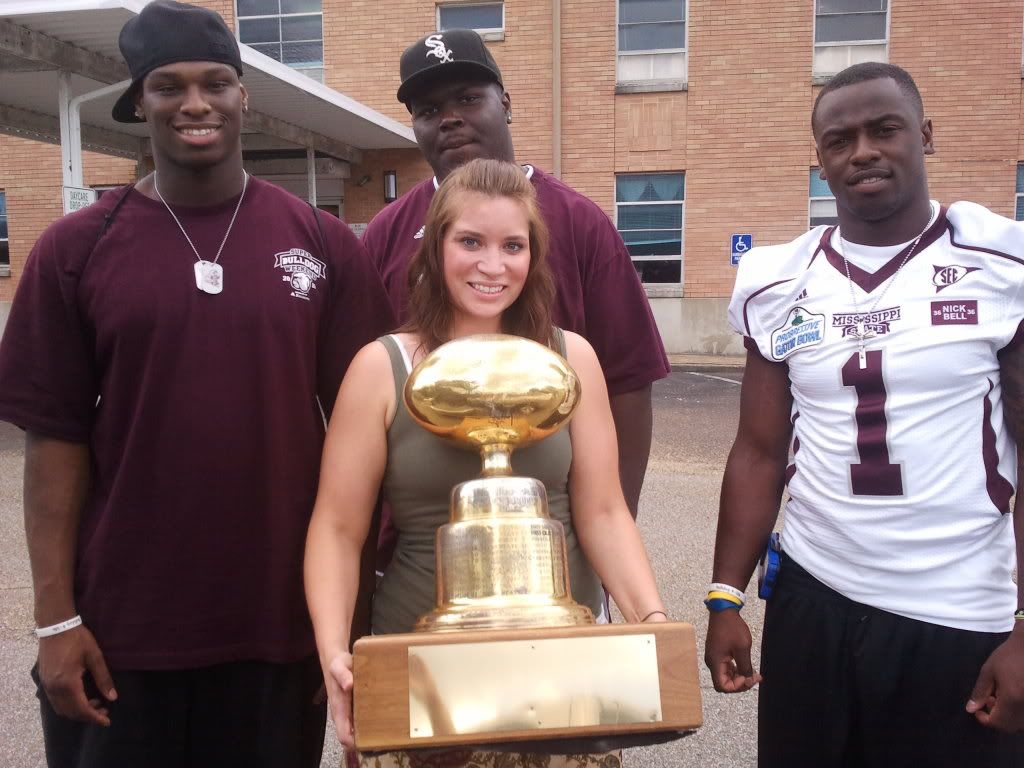 She works at a Church Daycare facility in Starkvegas. Some members of the team brought it by to show the kids. She got a picture with it, and some of the guys, in the parking lot. She is not much of a sports fan, but she enjoys the Bulldogs football and Baseball now since she has been on campus.