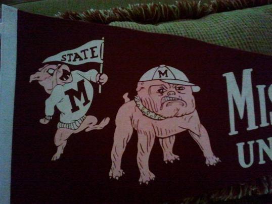 I just bought two pennants this morning at an estate sale, and I'm trying to date each of them. One is normal size pennant that has two different bulldogs on it, and the second is aset of mini pennants strung together with the original members of the SEC. My best guess is that the set of SEC pennants is frome the 50's as the one for MSU has Miss State College on it....The big MSU pennant I'm assuming is from the 60's asit says Miss State University....