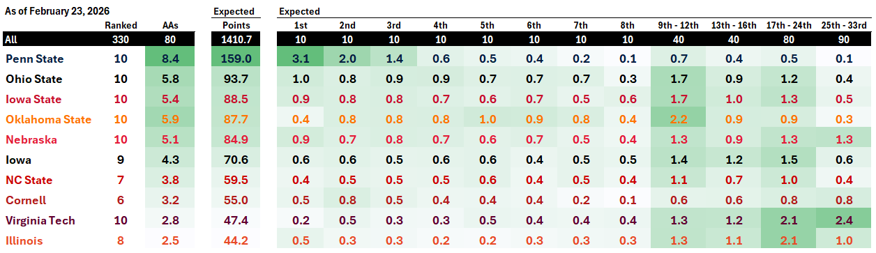 - Iowa - sigh. I fear the rankings have not caught up to there current state. I fear this estimate may be on the high side. There are just so many unknowns about this team. Who are the starters at four (?) weights? How injured are Ferrari and Kueter and what will they look like after being out so long? Obviously all of these questions will be answered at B1G.