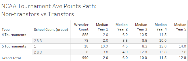 I am glad you asked. I had the thought that maybe there was a difference between the experience of wrestlers who spent their entire career with a single school vs those who wrestled for more than one school at the NCAA tournament.