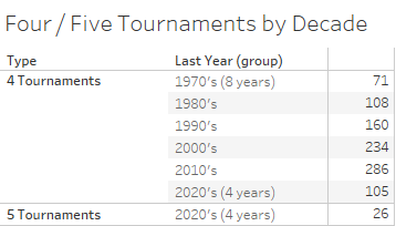 The numbers of wrestlers with long tournament careers have been steadily growing by the decade. From an average of ~9 per year in the 1970's it has grown to over 31 per year so far this decade