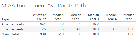 Using NCAA tournament results from 1969 - 2025 I identified 990 wrestlers who participated in either four or five tournaments AND scored in at least three tournaments - 964 four tournament wrestlers and 26 five tournament wrestlers. Then I examined their career trajectories using total NCAA tournament points scored by year.