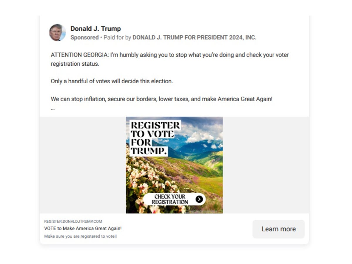 Nope. Nice try though. They used a picture of the COUNTRY Georgia, not the STATE. :joy:Not really. Although you can't "register to vote" for a particular candidate, there is nothing wrong with a particular candidate urging his supporters to make sure they're registered to vote. It's no different than Dems holding mass voter registration drives for students on College campuses. They don't actually tell those kids to vote Democrat, but most assume they will.