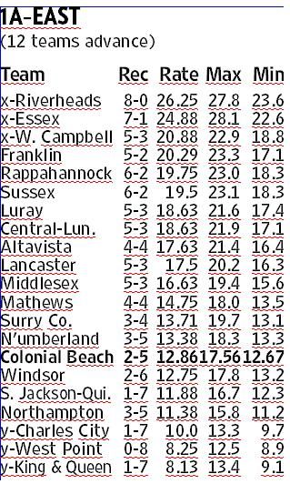 I dont know anything about either King George or Chancellor but if you go to the VHSL Game Simulator it has Chancellor winning 83% of the time. Chancellor has won 13 of the last 14 meetings.I have Essex projected to jump Riverheads on last week by 1 point if both teams win remaining 2 games. I have Essex finishing with 275 and Riverheads with 274.