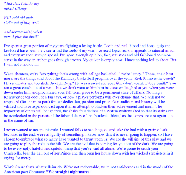 I can't hate that kid. I was going nuts when Dawg was dawgin, too.If the 1st Kentucky player you think of when you think about Kentucky-Duke games is Dawg Carruth, you pretty much suck as a fan. He has his place, but come on...that's terrible. KSR, get your act together. Jack Givens, Scott Padgett, and Cameron Mills think that's unforgivable.