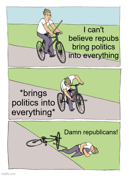 Wait...I post an observation, didn't mention trans first, you claim I'm making this political, and then you follow up with a giant cartoon photo which is political. So you're doing the thing you keep saying I'm doing. You cannot be this bored on a Tuesday night.