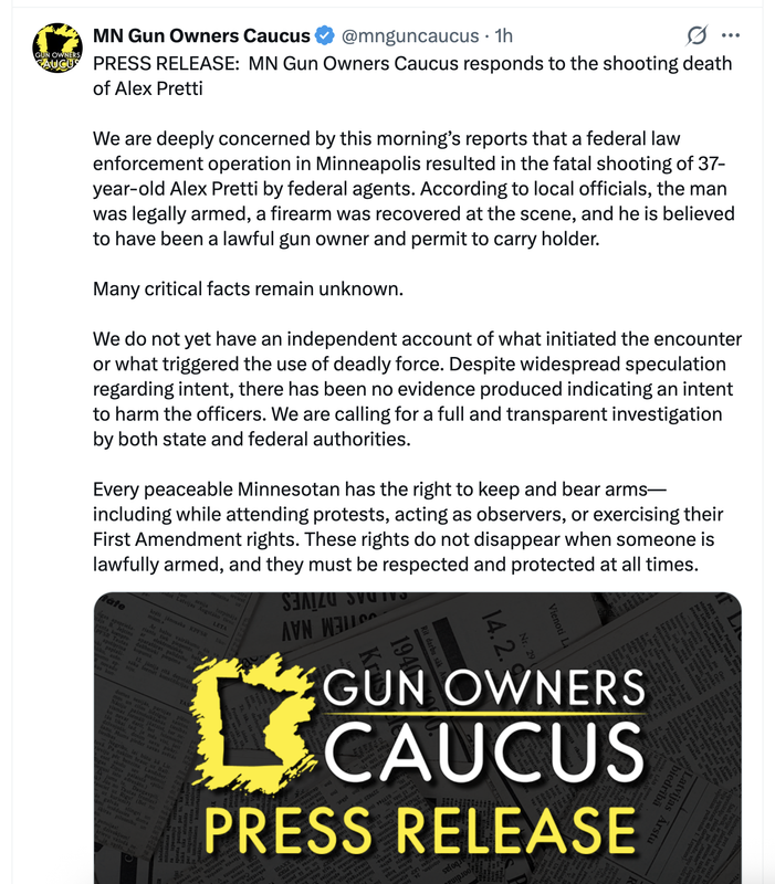 He rightly points out that if the murdered man had shown up on scene brandishing a weapon towards agents then an immediate firefight would have ensued instead of random brownshirts pushing the woman down next to him and spraying her in the face. They clearly weren't worried about this guy being armed (which is his 2A right) on the scene, and he didn't do anything towards them on video that indicates he was a threat.