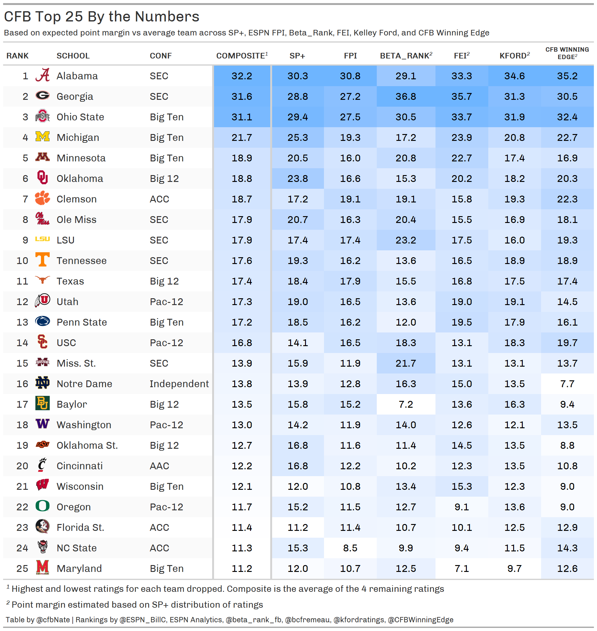 Don't believe me? Here are some links to a few widely available power ratings for the purpose of establishing point spreads. I'll throw in SP+ as well, which has been very good in the past, but take it with a grain of salt since it is almost entirely data driven.