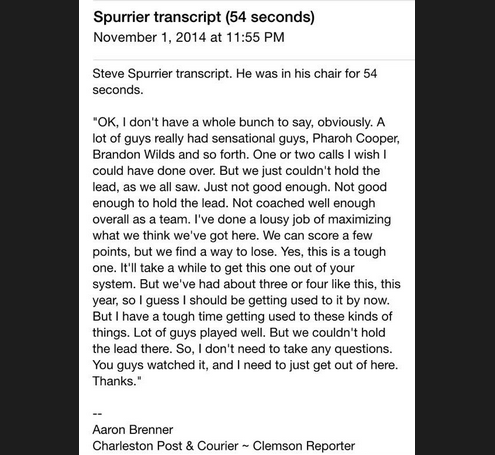 His post game presser lasted 54 seconds. If he would have gone a few more seconds it would have lasted longer than the TN game tying drive.