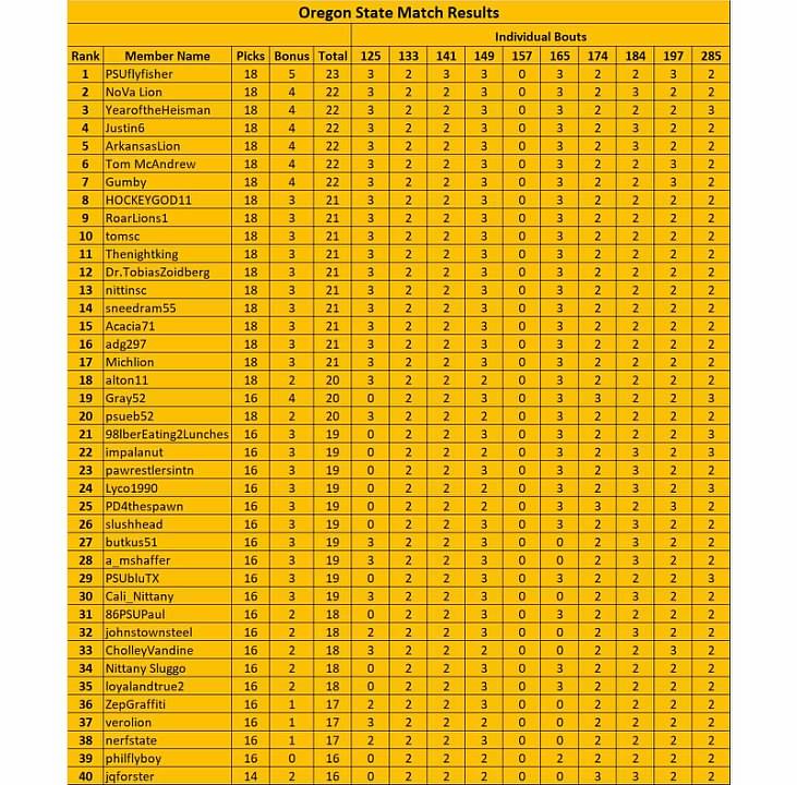 * The lineup will not always be certain; when things look iffy, I will try to post multiple wrestlers at a given weight class, and participants should post their predictions for each wrestler. Generally, I will try to base the lineup on what is presented in the "Match Notes" published by PSU several days prior to the event.