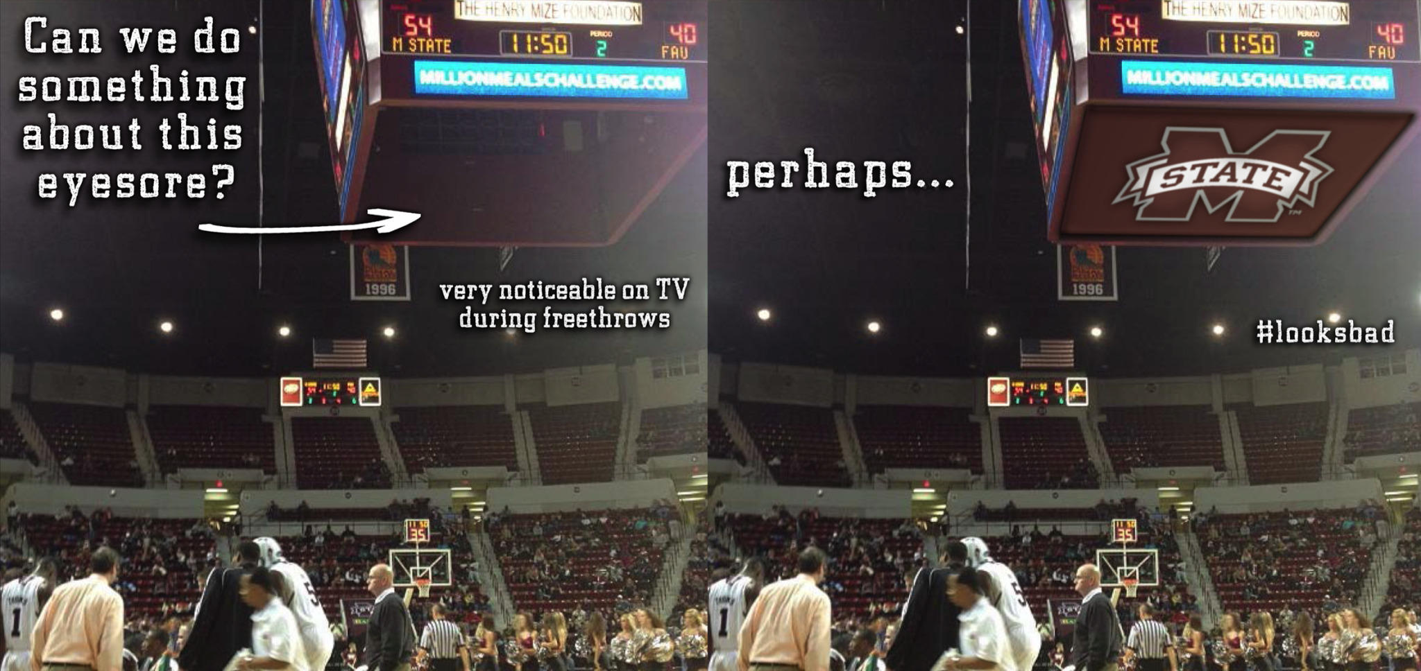 We are the only school/organization (that I've seen) that doesnt have a "covering". I mean, u can see straight up that thing and see all the guts and wires! For instance, When Bama shoots freethrows, u get a great view of their logo on the underside of their scoreboard.