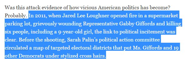 “In 2011, when Jared Lee Loughner opened fire in a supermarket parking lot, grievously wounding Representative Gabby Giffords and killing six people, including a 9-year-old girl, the link to political incitement was clear. Before the shooting, Sarah Palin’s political action committee circulated a map of targeted electoral districts that put Ms. Giffords and 19 other Democrats under stylized cross hairs,” the editors wrote.