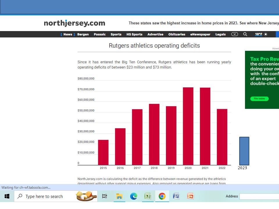 Thank you for posting this. I do not know how northjersey.com calculates the losses. I use the #s Rutgers athletics provides to the NCAA that are audited by KPMG and certified by Jonathan Holloway.fyi, your 2022 operating loss is understated per Northjersey.com. Their analysis published feb 2023 shows a MAJOR reduction in Athletic Operating loss and back to 2015/2016 levels! MINUS 47% !! (ASSUMING YOUR 2023 numbers are correct)
