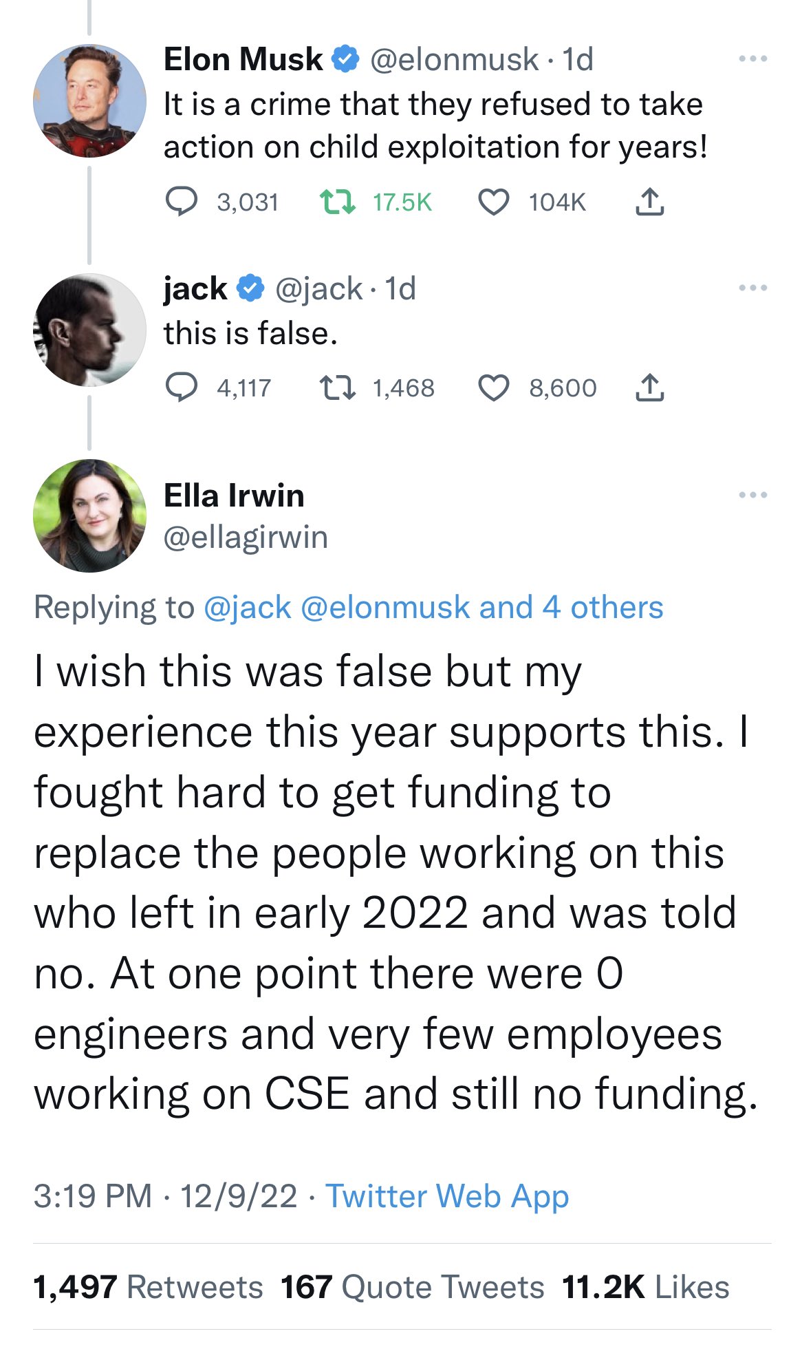 What is your opinion now that with all the twitter files being exposed? Are you happy they are attacking child porn and child exploitation on the site? Are you upset that the co was working with the government to censor certain political beliefs?