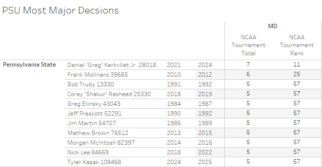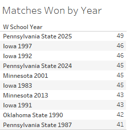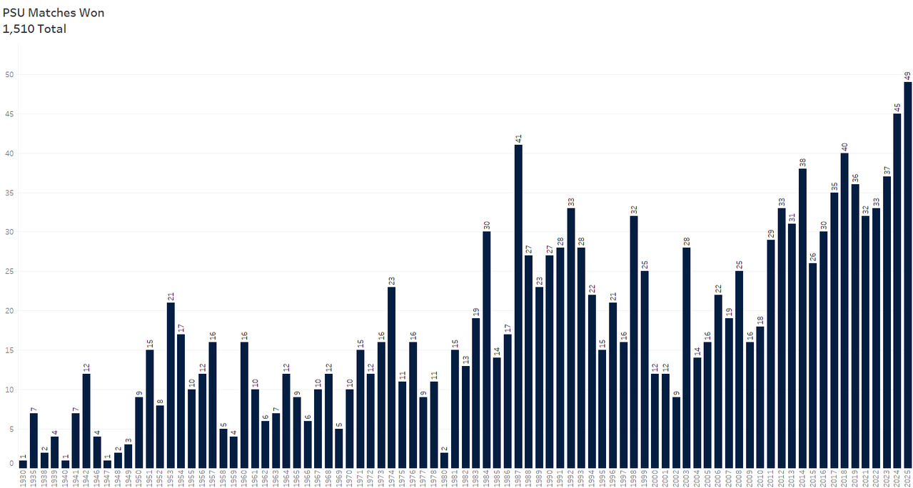 • Things have improved since then. Penn State now owns 1,510 victories, placing them fifth on the all-time list behind Oklahoma State (2,395), Iowa (1,948), Iowa State (1,687), and Oklahoma (1,583). Penn State likely moves up to fourth after the 2027 tournament.