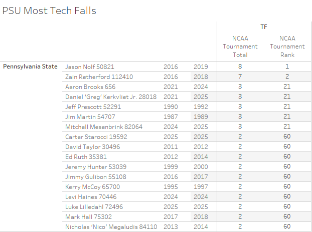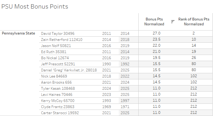 Below are the PSU top 10 (and ties) all-time leaders in majors, techs, pinfalls, and bonus points (normalized for today's scoring rules) along with their overall rank in NCAA tournament history.