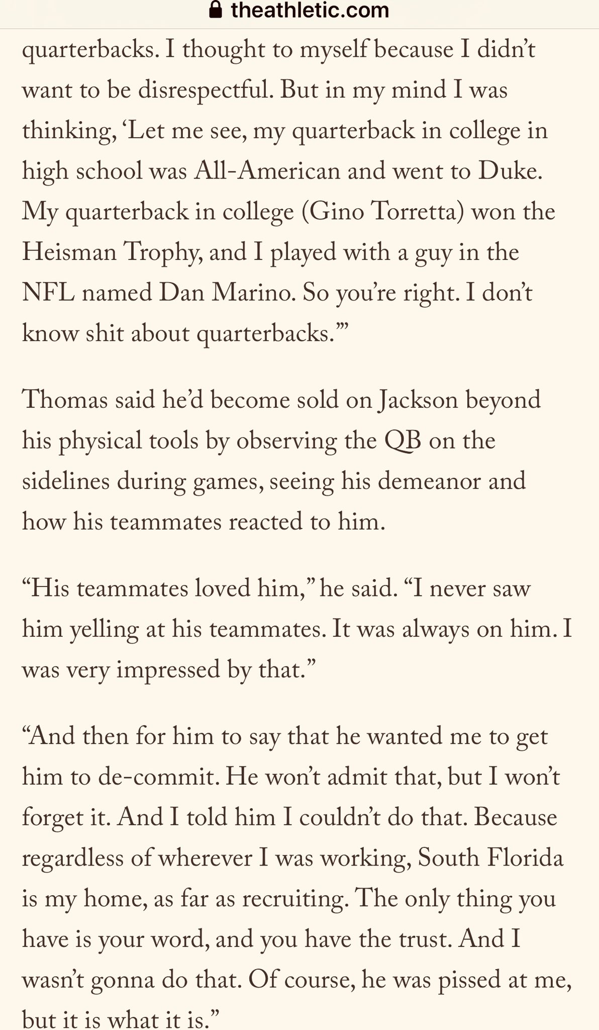 This is an excerpt from The Athletic about Lamar Thomas' recruitment of Lamar Jackson. He claims Petrino wanted LJ to de-commit. Unbelievable, if true.
