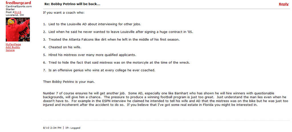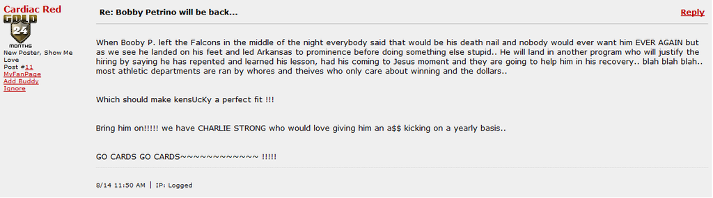 I have read this thread, and many card fans are what is wrong with the world in general.. no accountability for jack ****. YOU and your UNIVERSITY are one of the many reasons grown f'n men keep on messing up over and over and over again and KNOW that there is a sucker like U OF CRAP (L) to give them an opportunity because they are good at a single thing... and that single thing is coaching or playing a sport. You bunch of irrational troglodytes need to wake up and think like an adult and not just about the product (or lack of it) on the field. The "it is what it is" mindless phrase is for folks who don't like to think and analyse a subject/situation and just accept it because they are either not affected or it brings a positive effect to their sports needs... I just hope you don't come crying when your team ends up being the first since SMU with a death penalty for your irrational and illogical actions.