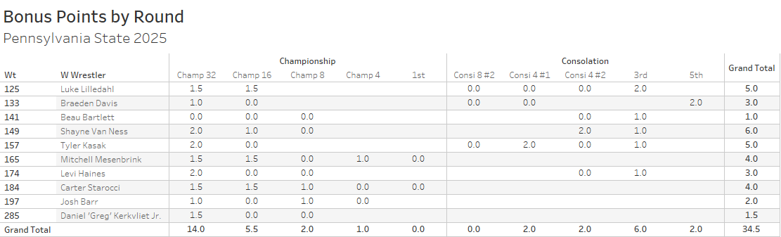 Bonus was perfectly evenly split between championship and consolation. Similarly, but at opposite ends of the bracket, PSU dominated round one (1.4 bonus per) and the third place matches (1.2 bonus per).