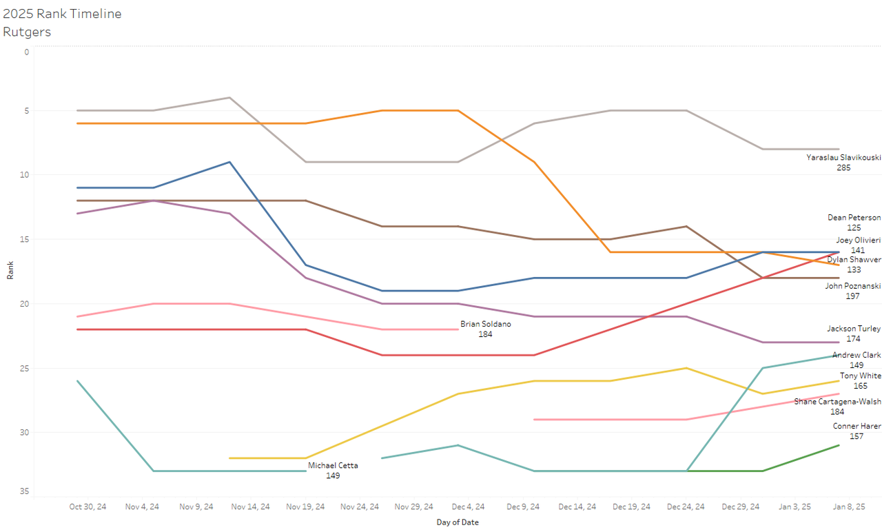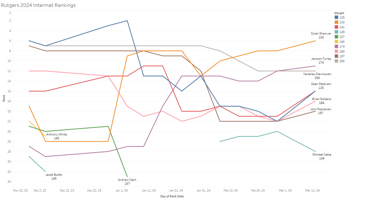 Thank you. Tuesday blew past me this week. I updated it last night. It was a very good week for the Rutgers guys after their best performance in memory. There were some significant jumps in ranking. Interesting that Olivieri and White increased their rank without even competing. Turley went up one after a loss. Peterson and Shawver are moving closer to their potential. SCW is starting to get noticed and moved up nine places and has an easier time coming on Sunday before two bone-crusher matches the following week. Harer is coming along and will benefit if he develops more offense, but he is slow to get recognition. Barbosa, if the choice going forward, will chip away at the rankings but has two brick walls to face after the Wisconsin match.