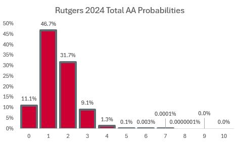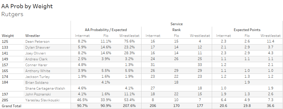 • Aggregating across all ten weights using Intermat rankings suggest Rutgers has a 91% chance of 1 AA. Replace that with WrestleStat rankings and the expectation is to have roughly 2 AAs. I can also calculate the odds of any number from 0 to 10 AAs.