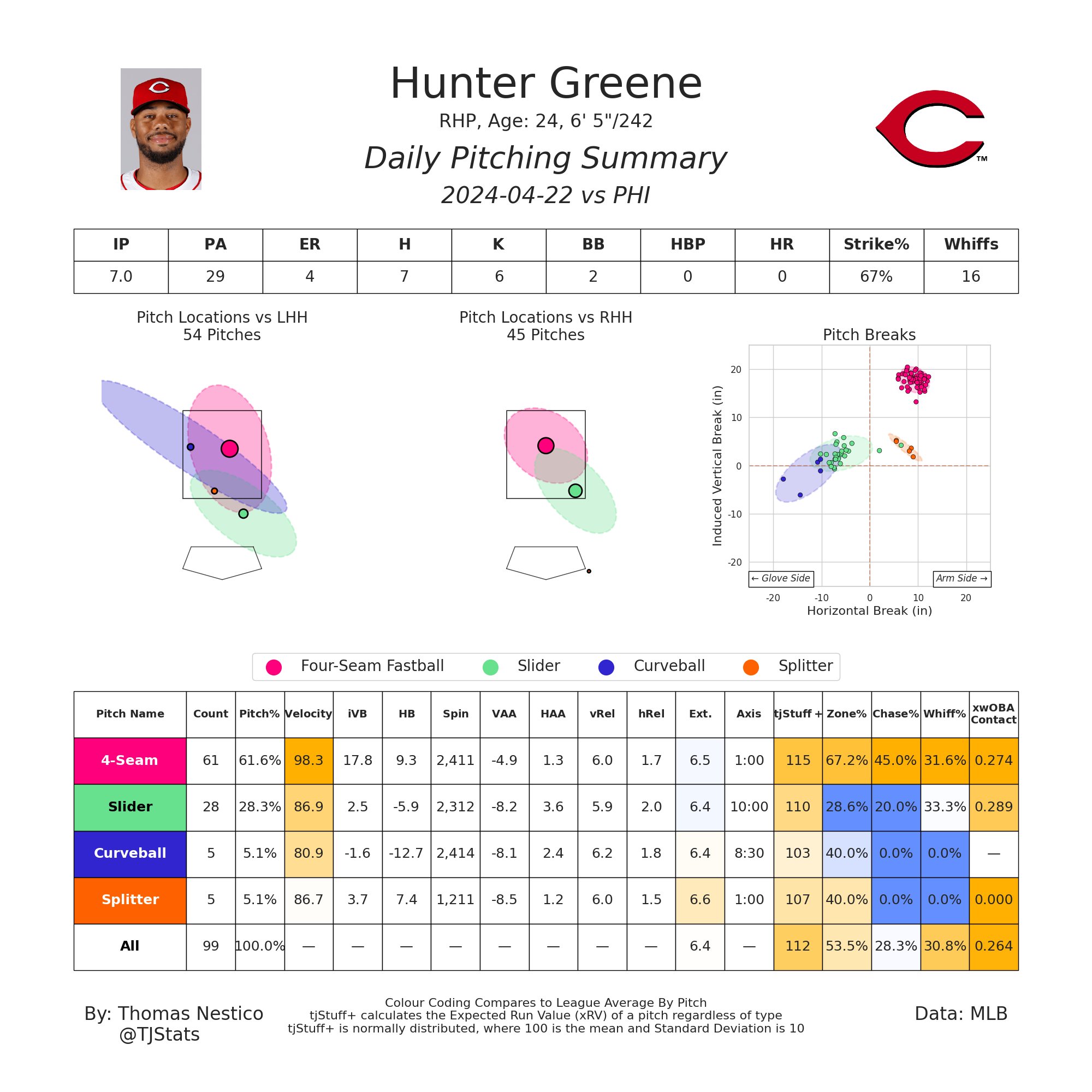 Hunter Greene may have the most velocity on the team but hardly the best stuff on the pitching staff. On average this year, he relies on a 4-seam fastball 50% of the time, a slider about 40% of his pitches and a splitter and curveball that he doesn't trust to go to very often. Tonight, he relied even heavier on the four-seamer for over 61% of his pitches.