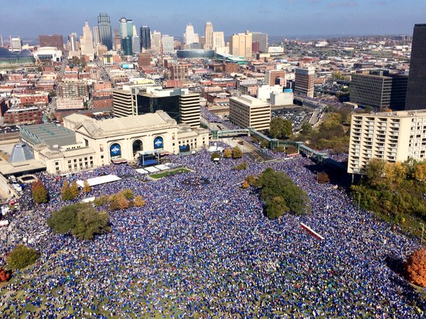 I live in KC and last night on the news they said city officials were anticipating 200k people. I started laughing and looked at my wife and said, "they must be using 1985 census data because I guarantee there will be at least 500k people downtown tomorrow." Sure enough, 500k is the estimate that is coming in. That's roughly 1/4 the entire metro population. I counted 44 local public school districts that canceled school today. The Johnson County health authority where I live started making "epidemic files" of Blue Flu that was contracted at 11:38 pm on 11-1-15 and cured 12:00 pm 11-3-15. It nuts.