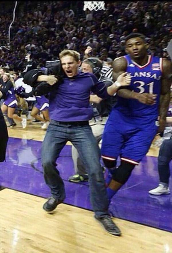 I guess there was KSU fan who threw an elbow at one of the Kansas players as well. Stuff like this needs to stop. I think it needs to start with the Coaches and players before the games. I understand celebrating a win but theres got to be a safer way.