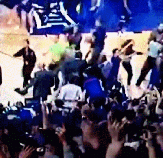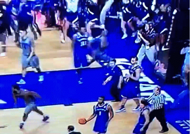 I have always been a big opponent of the court storming. This just solidifies that opinion. It's dumb and dangerous. It's only a my yet of time before some idiot does some real damage. It puts the player and coaches my danger as well as the refs. If I am a player and I see someone coming at me and feel threatened, I'm going to defend myself as well. Which would lead to other bad things. It's just a bad situation that needs to be stopped before something really bad happens.