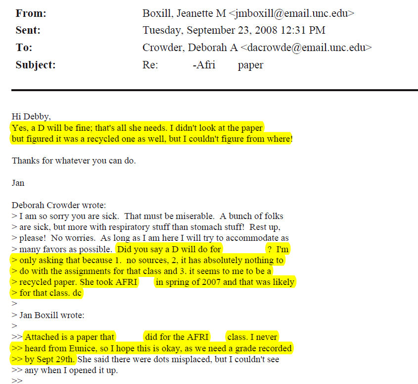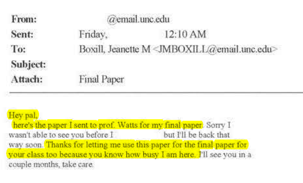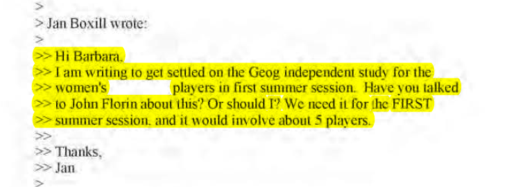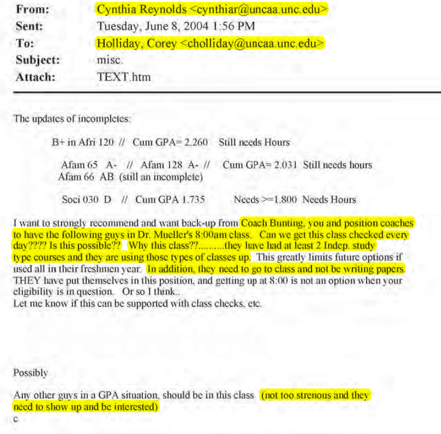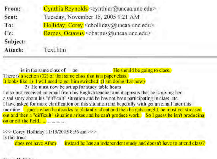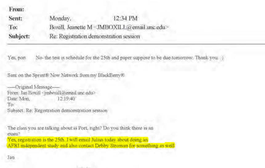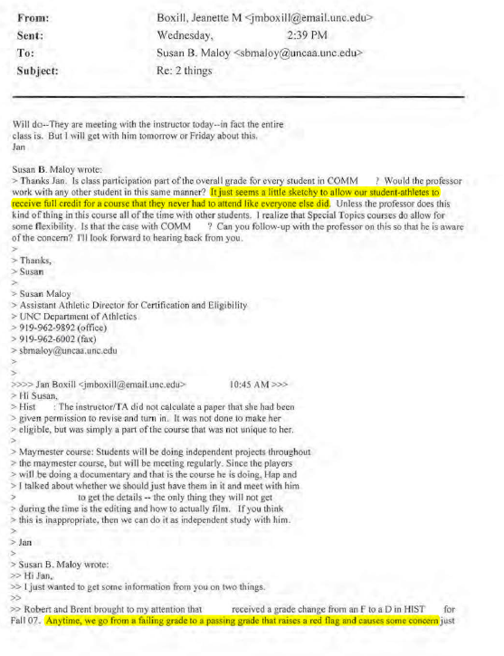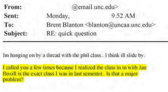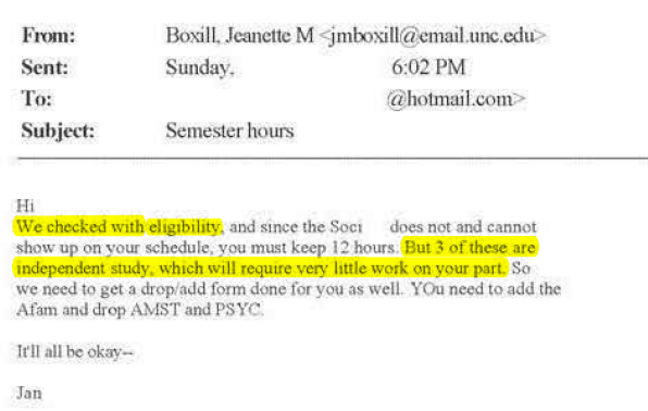 Never ceases to amaze me how matter-of-factly the scam was talked about. Boxill tellin' the athlete the 3 courses added will require "very little work." One other thing. Many of these have the DATES REDACTED! Check the last sentence telling the jock to drop two courses and add the AFAM. The reason for this is because basic rules are being ignored. unx is allowing jocks to drop/add courses on a whim. Failing a class? Only 2 weeks left in the semester? No problem. We got yer back. Drop those add these. But regular students could do that too , right? Disgusting...
