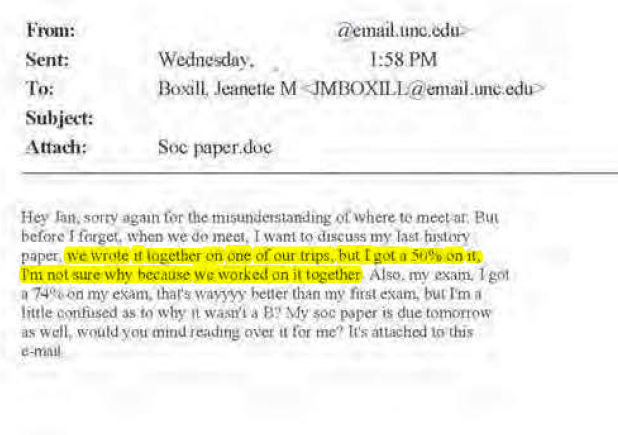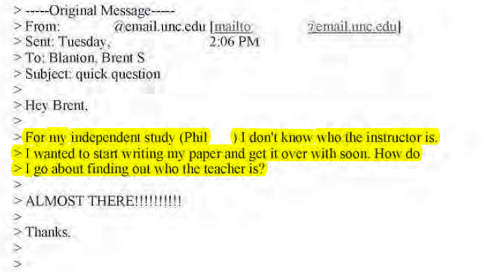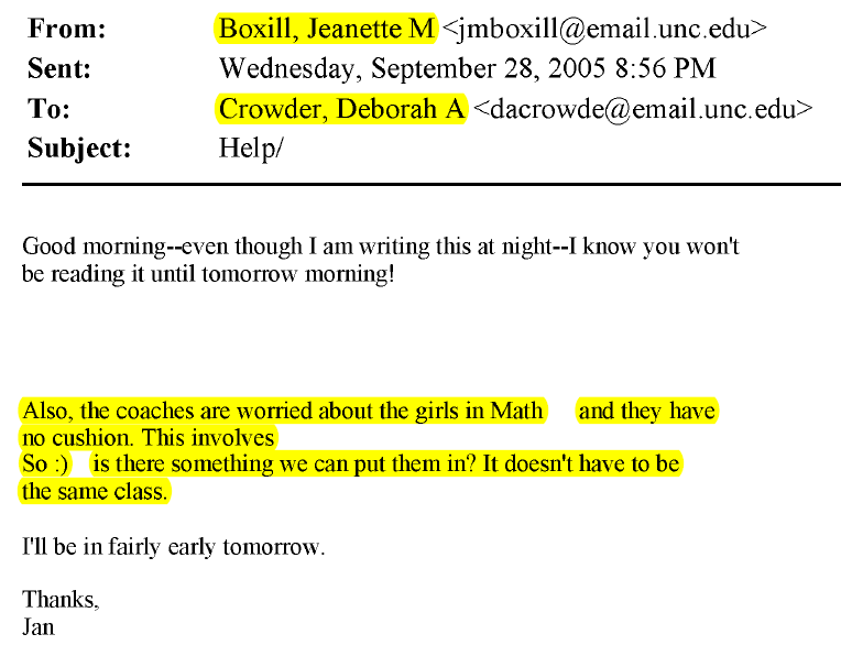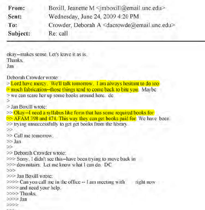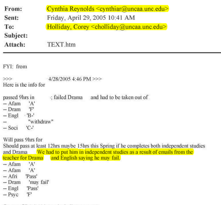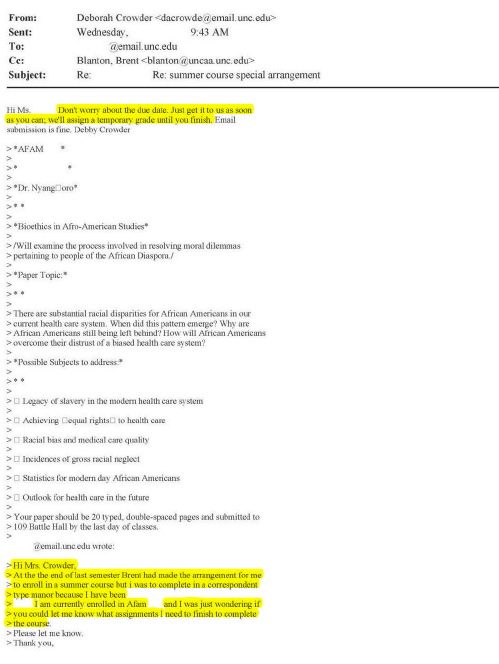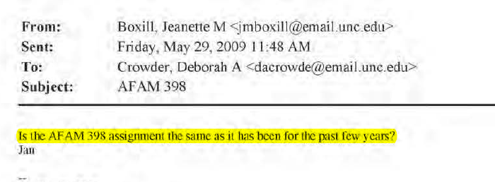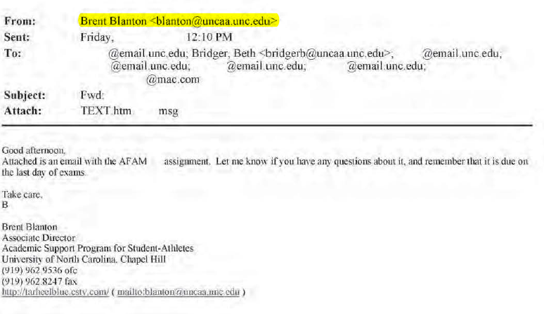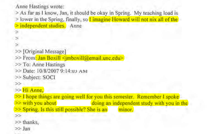 Never ceases to amaze me how matter-of-factly the scam was talked about. Boxill tellin' the athlete the 3 courses added will require "very little work." One other thing. Many of these have the DATES REDACTED! Check the last sentence telling the jock to drop two courses and add the AFAM. The reason for this is because basic rules are being ignored. unx is allowing jocks to drop/add courses on a whim. Failing a class? Only 2 weeks left in the semester? No problem. We got yer back. Drop those add these. But regular students could do that too , right? Disgusting...