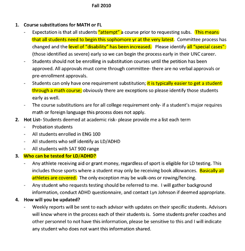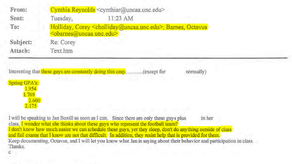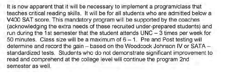 Kotis' concerns are well-founded. Only at unx do student-athletes graduate at a higher rate than non-athletes. Of course non-athletes don't get all the "help" the jocks get either. And LMMFAO at Folt's comments about the SAT. Biased or not , it has bupkiss to do with unx's admission policies for athletes. Classic tarhole PR diversion. Change the subject. #carolinaway.