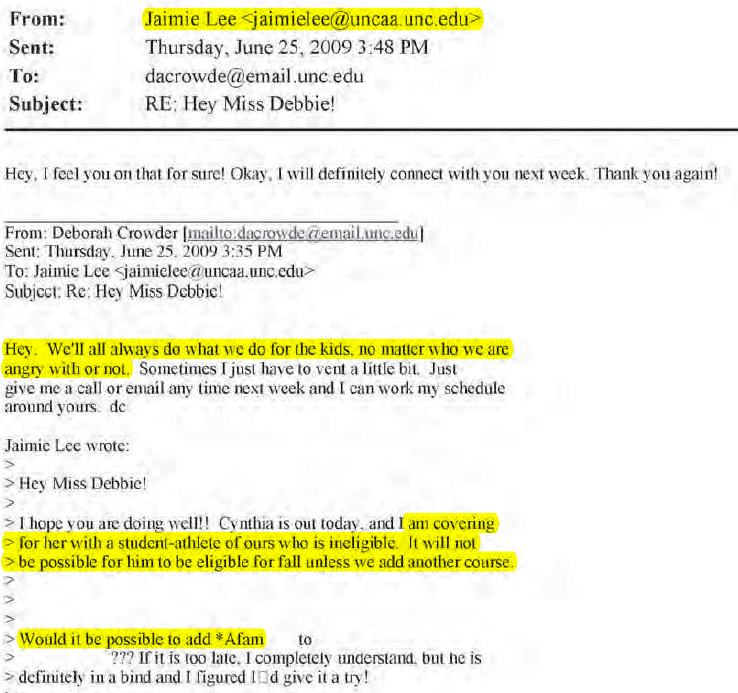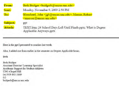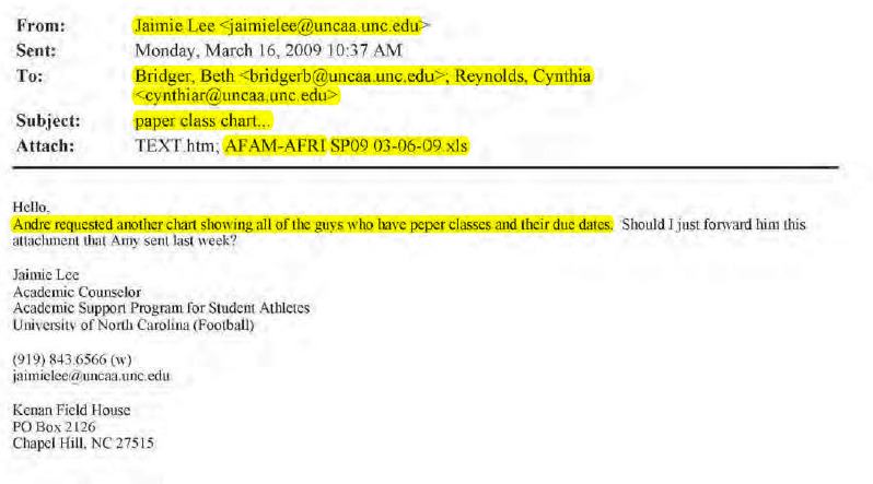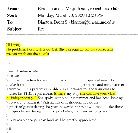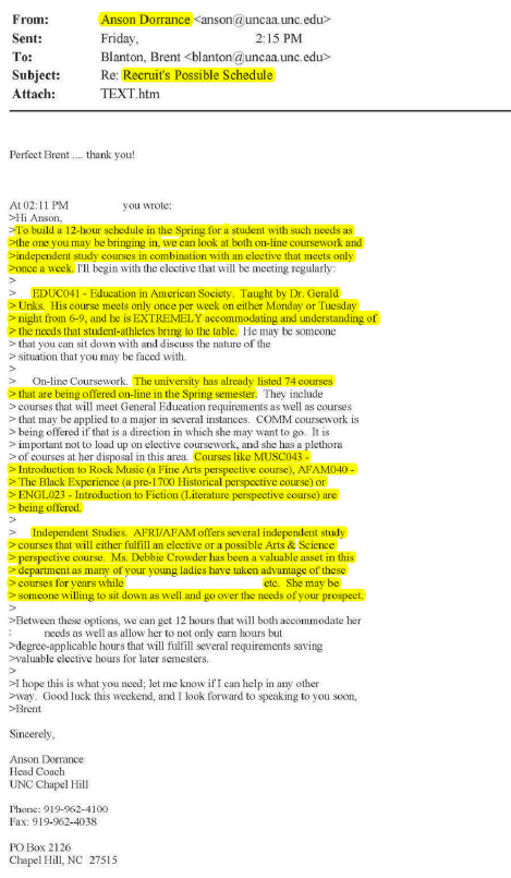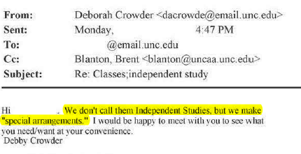 How it's done. Building an athlete's schedule via paper classes , on-line classes and crip courses. Mary termed this a "degree in Eligibility." #carolinaway. And again...how many people musta known? Heck , who DIDN'T know? We've seen these e-mails , a power point presentation and THIS next one sent directly to a coach... a head coach at that. Anson Dorrance of that vaunted unx women's soccer program. Now we know how they amassed that gaudy winning record. And this is soccer we're talkin' about. WOMEN'S soccer , fer cryin' out loud!!! But none of this was done for football and men's basketball , right? Roy didn't know? My azz. Gawd. What a mess...