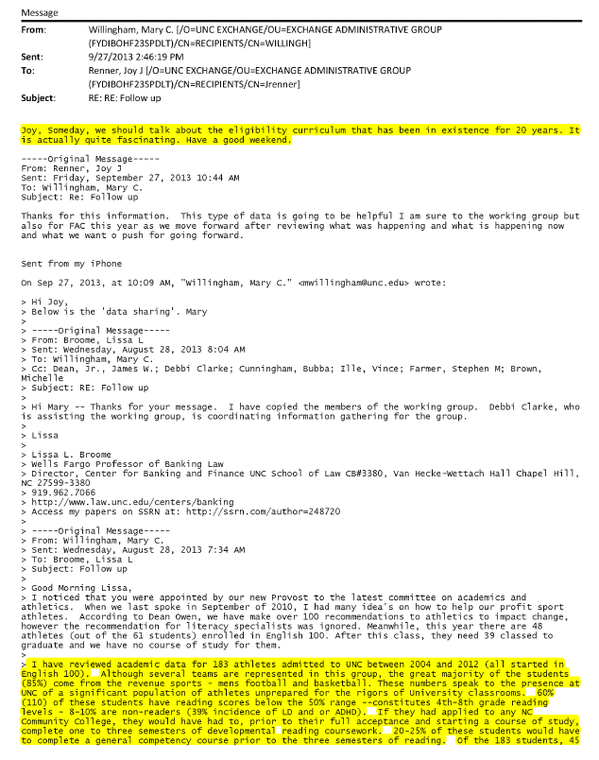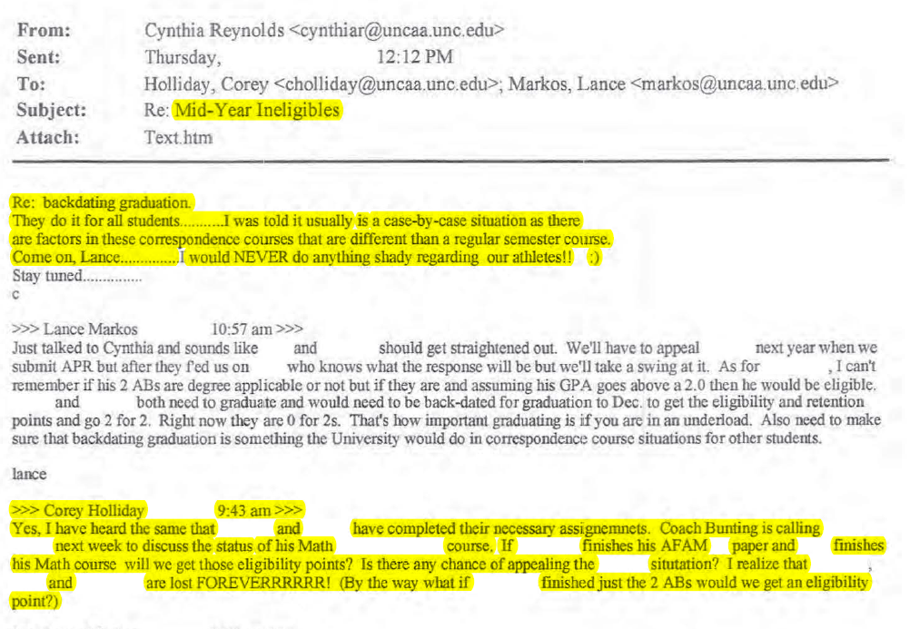 Briefly , I can say for sure that many of these latest e-mails come from the NCAA's NOA. IOW , they have these AND they have 'em un-redacted. And keep in mind , unx FERPAS every-damn-thing , drags azz on complying with FOIA laws and , of course , redacts the life outta whatever they decide to release. Lord knows what we're NOT seeing.