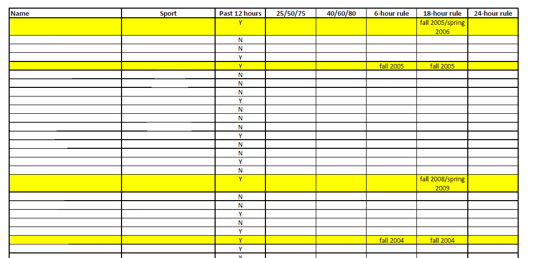 Document illustrating how the NCAA has seen which jocks and which sports were involved in the paper class scam...