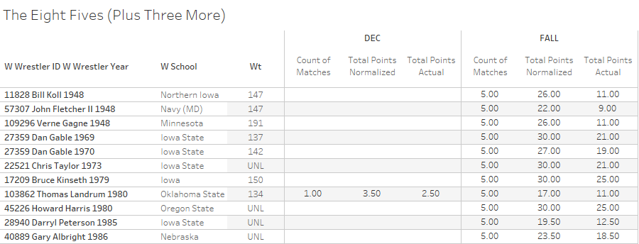Now it is time to come clean. When I came up with the question I had a filter on the data from 1950 - 2025. Turns out there were THREE guys who had five pins in 1948. Wild. But that was also a weird year where they use the tournament as a semifinal for the Olympic trials, wrestled freestyle (apparently to everyone's surprise), and used the black mark system rather than a traditional bracket.