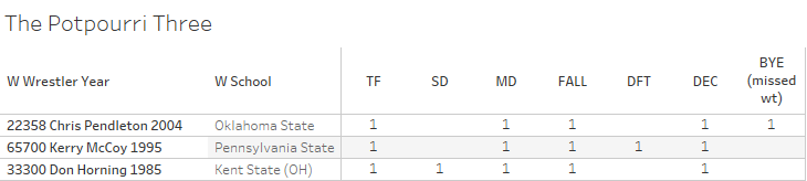 Three wrestlers won matches five different ways in a single NCAA tournament. First round "byes" when it was scored as a 64 man bracket are excluded.