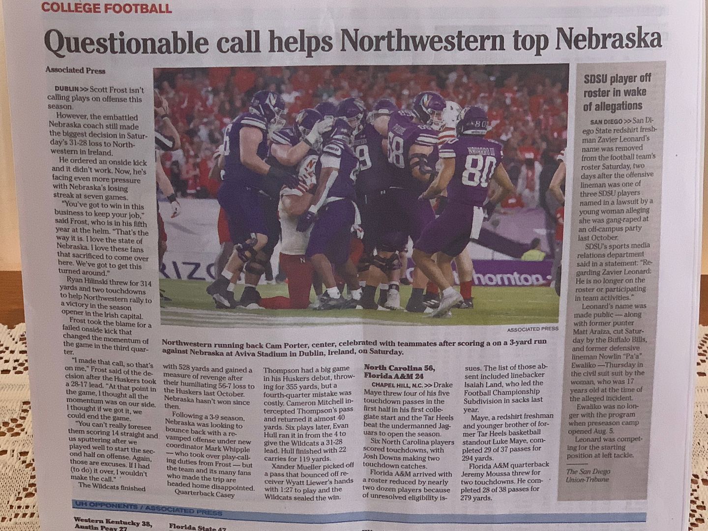 Yeah, that onside kick seems to be the story of the game so far as the media is concerned. In the Sunday Paper here where I presently am the Sports Page Headline read, "Questionable call helpsNorthwestern top Nebraska," referring to the call Frost made.